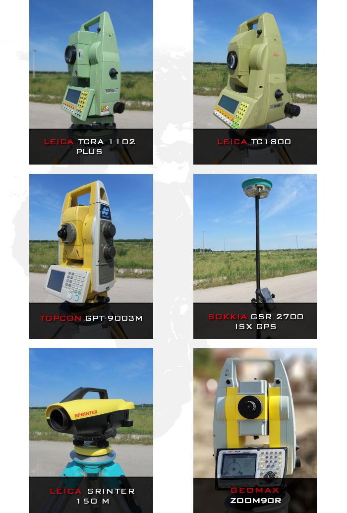 A cég teljes körû ingatlanrendezôi és geodéziai tervezôi jogosultsággal rendelkezik. Mûszerparkunkat 2 darab szélsô pontosságú mérôállomás, kétfrekvenciás RTK GPS vevô, digitális és automata szintezô alkotja, mely az összes geodéziai feladat ellátására alkalmas.
