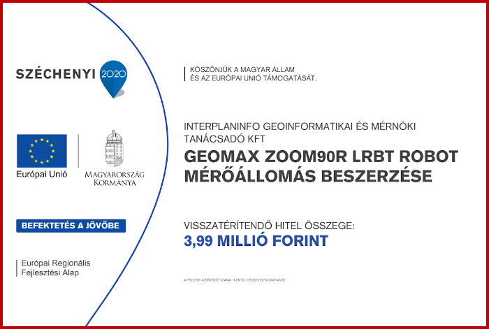 - Az Interplaninfo Geoinformatikai és Mérnöki Tanácsadó Kft. Geomax Zoom90R LRBT robot mérőállomás beszerzésére 3.99 millió forint visszatéritendő hitelt kapott az Európai Regionális Fejlesztési Alap támogatásából.